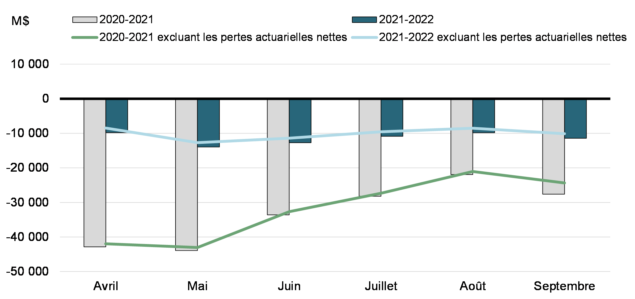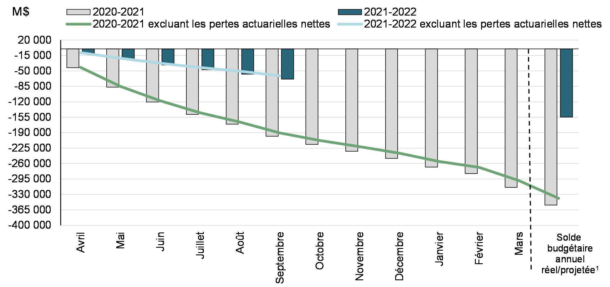 Le mois de septembre 2021 s'est soldé par un déficit budgétaire de 11,4 milliards de dollars, comparativement à un déficit de 27,6 milliards en septembre 2020. Le déficit budgétaire avant les pertes actuarielles nettes se chiffrait à 10,1 milliards de dollars, comparativement à un déficit de 24,4 milliards pour la même période de 2020-2021. Le solde budgétaire excluant les pertes actuarielles nettes a pour but de compléter le solde budgétaire traditionnel afin de rendre les rapports financiers du gouvernement plus transparents, en isolant l'incidence de l'amortissement des pertes actuarielles nettes découlant de la réévaluation des régimes de retraite et autres avantages futurs des employés du gouvernement.