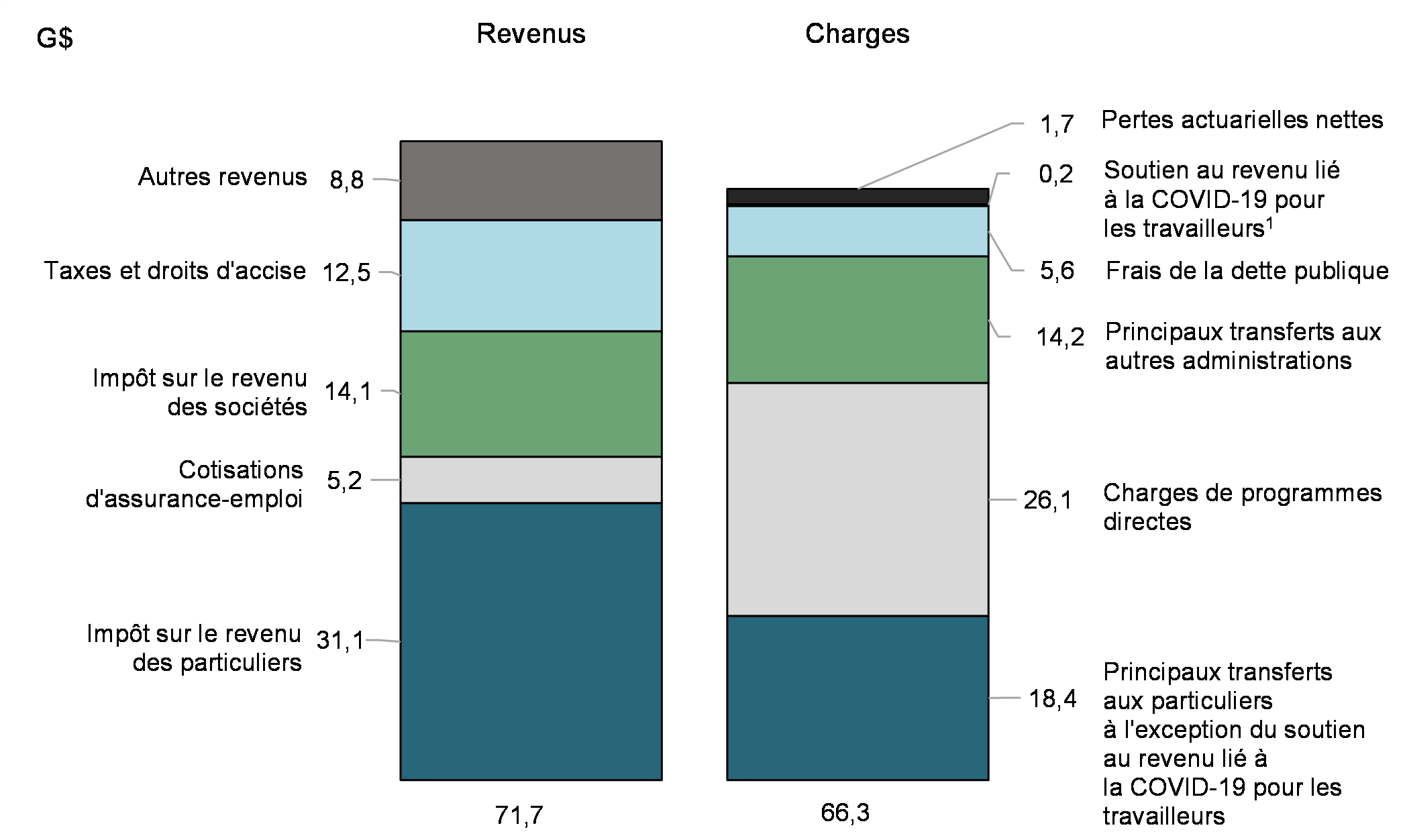 - Le soutien au revenu lié à la COVID-19 pour les travailleurs a diminué de 4,5 milliards de dollars (95,7 %), en raison de l'élimination progressive de la Prestation canadienne de relance économique en 2021-2022.
