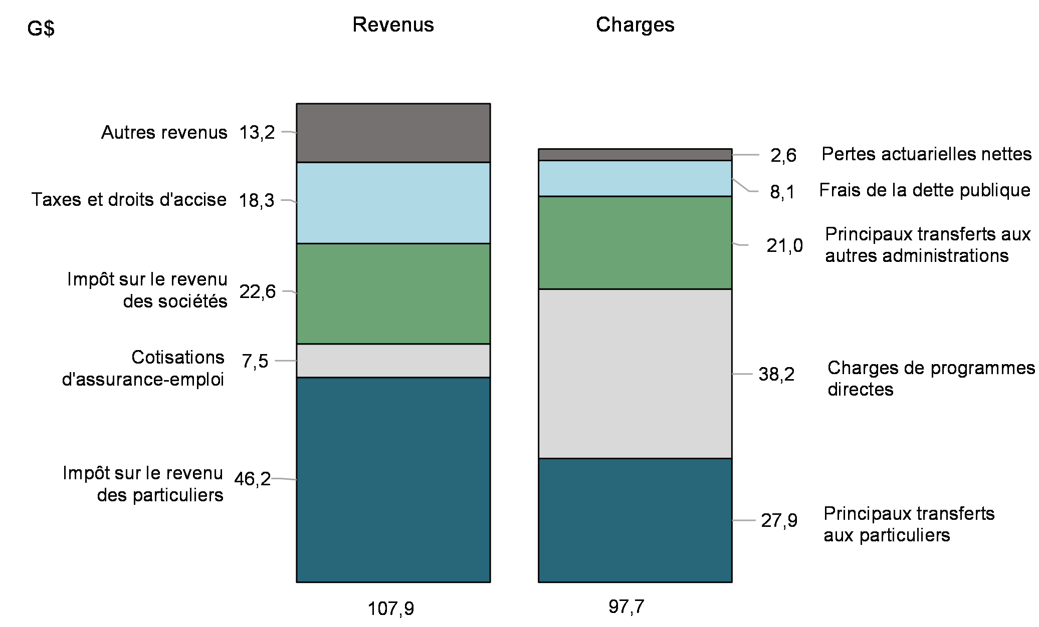 Le solde budgétaire est présenté selon la méthode de la comptabilité d'exercice, les revenus et les charges de l'État étant constatés au moment où les revenus sont gagnés et les charges sont engagées, peu importe le moment où surviennent les rentrées et les sorties de fonds correspondantes. En revanche, les ressources ou besoins financiers représentent l'écart entre les rentrées et les sorties de fonds de l'État. Cette mesure tient compte non seulement des variations du solde budgétaire, mais aussi des ressources ou des besoins en espèces découlant des investissements de l'État par voie d'acquisition d'immobilisations, de prêts, de placements et d'avances, ainsi que de ses autres activités, dont le paiement des comptes créditeurs, la perception des comptes débiteurs, les opérations de change et l'amortissement des immobilisations corporelles. L'écart entre le solde budgétaire et les ressources ou besoins financiers est constaté dans les opérations non budgétaires.