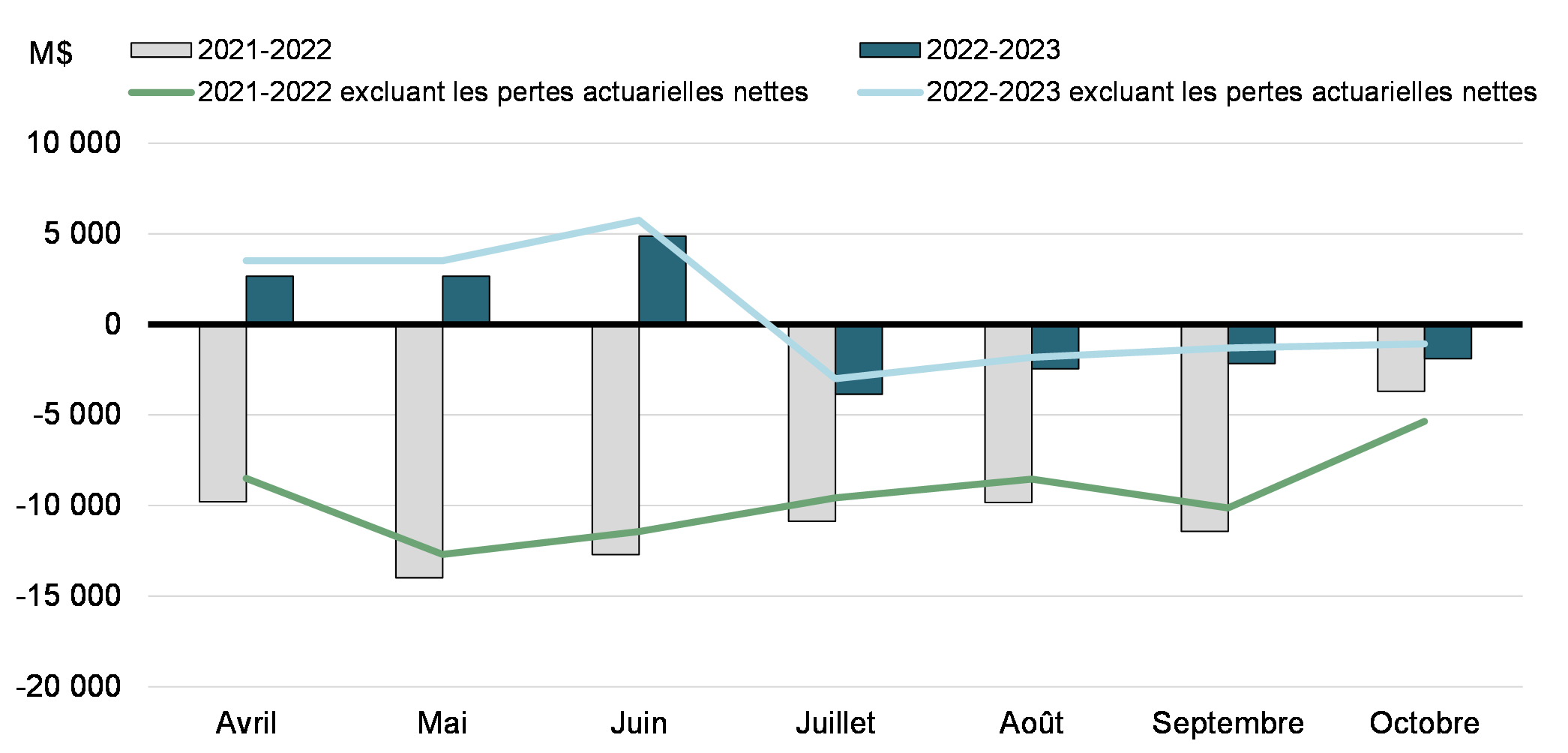 Le mois d’octobre 2022 s’est soldé par un déficit budgétaire de 1,9 milliard de dollars, comparativement à un déficit de 3,7 milliards en octobre 2021. Le déficit budgétaire avant les pertes actuarielles nettes se chiffrait à 1,1 milliard de dollars, comparativement à un déficit de 5,4 milliards pour la même période de 2021‑2022. Le solde budgétaire avant les pertes actuarielles nettes a pour but de compléter le solde budgétaire traditionnel afin de rendre les rapports financiers du gouvernement plus transparents, en isolant l’incidence de l’amortissement des pertes actuarielles nettes découlant de la réévaluation des régimes de retraite et autres avantages futurs des employés du gouvernement.