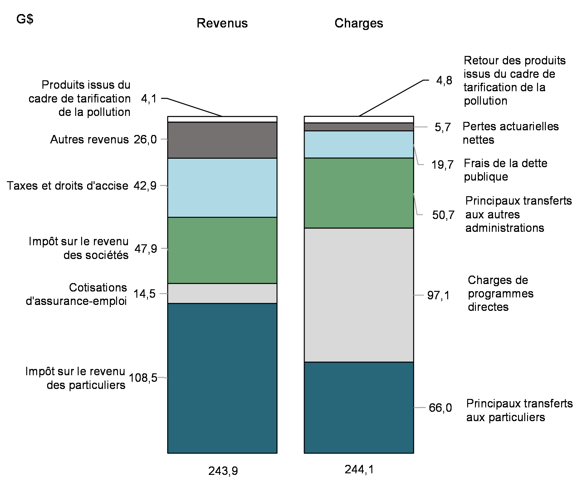 - Les charges de programmes excluant les pertes actuarielles nettes ont diminué de 40,4 milliards de dollars (15,6 %), principalement en raison de la baisse des paiements de transfert versés aux particuliers et aux entreprises causée par la fin des mesures temporaires relatives à la COVID‑19.