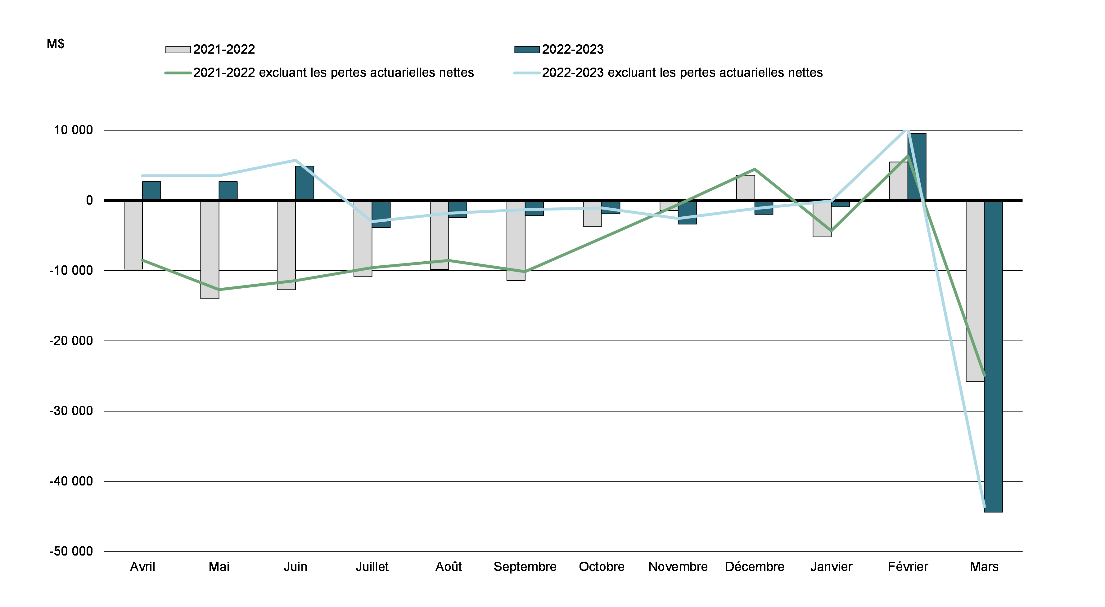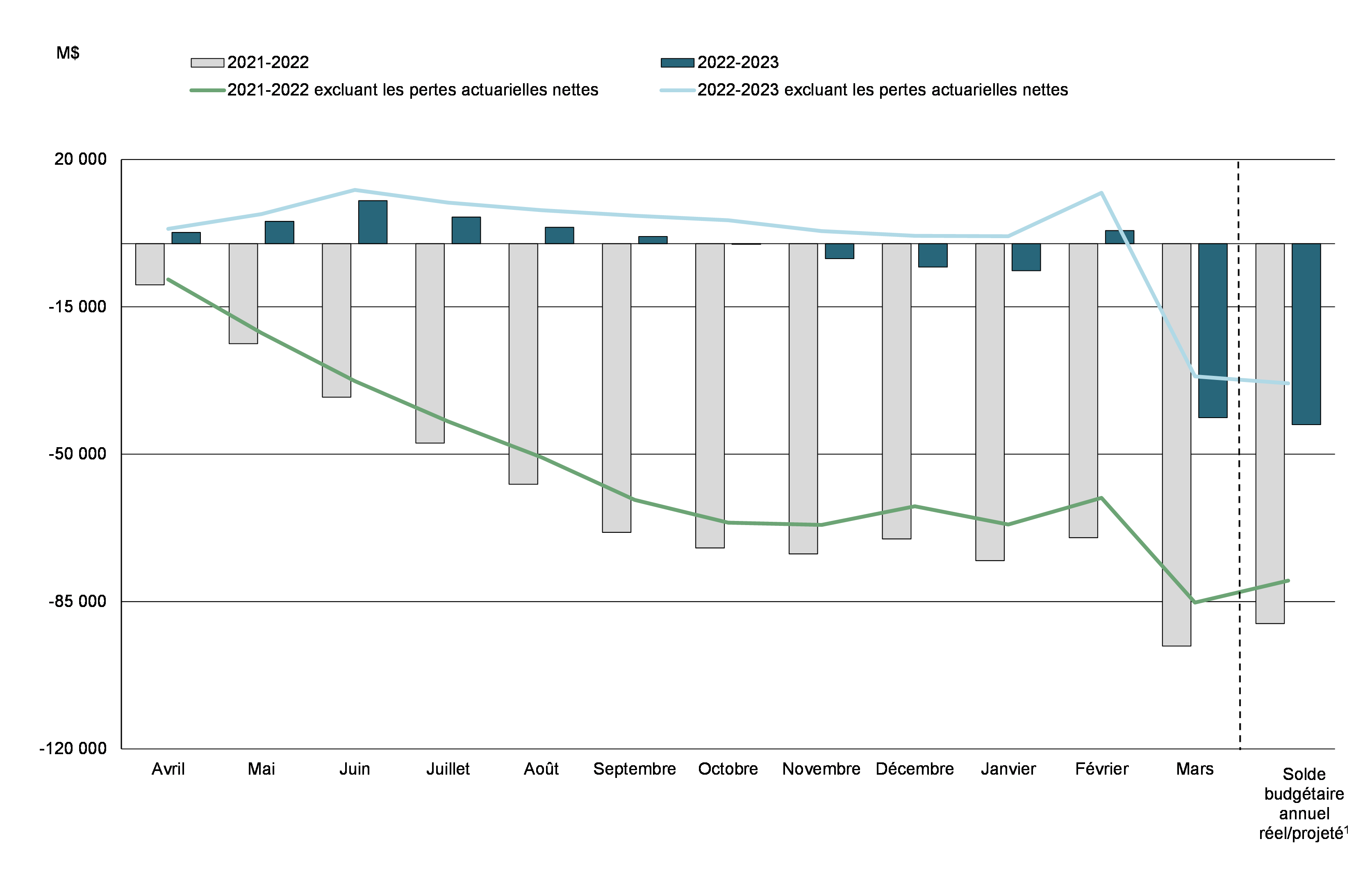 Le mois de mars 2023 s’est soldé par un déficit budgétaire de 44,4 milliards de dollars, comparativement à un déficit de 25,7 milliards de dollars en mars 2022. Le déficit budgétaire avant les pertes actuarielles nettes se chiffrait à 43,6 milliards de dollars, comparativement à un déficit de 24,9 milliards de dollars pour la même période de 2021‑2022. Le solde budgétaire avant les pertes actuarielles nettes a pour but de compléter le solde budgétaire traditionnel afin de rendre les rapports financiers du gouvernement plus transparents, en isolant l’incidence de l’amortissement des pertes actuarielles nettes découlant de la réévaluation des régimes de retraite et autres avantages futurs des employés du gouvernement.