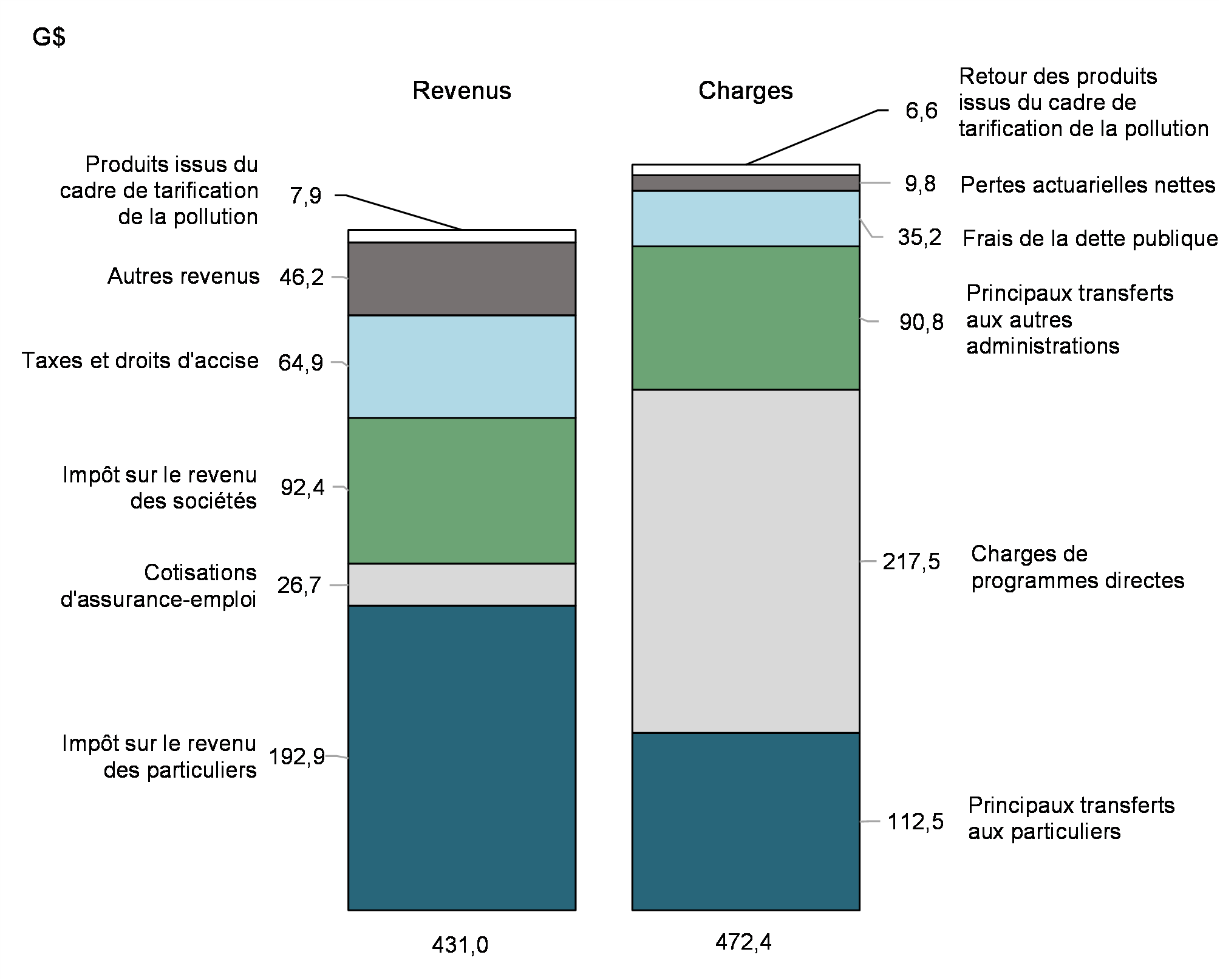 - Les produits issus du cadre du régime de tarification de la pollution ont augmenté de 2,1 milliards de dollars (36,5 %), sous l’effet du prix plus élevé de la pollution par le carbone en 2022 et 2023.