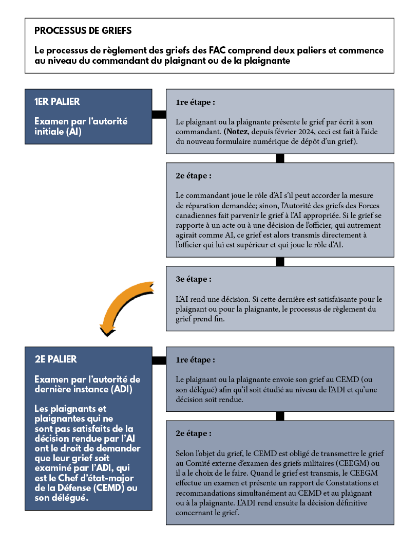 Le processus de règlement des griefs des FAC comprend deux paliers et commence au niveau du commandant du plaignant ou de la plaignante