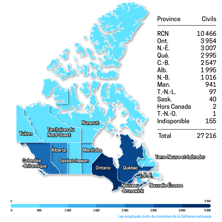 Près de 40 pour cent (10 466) des employés civils travaillent dans la région de la capitale nationale. Les employés civils représentent aussi une portion importante de l’effectif total des bases, escadres et établissements des Forces armées canadiennes partout au pays.[7]