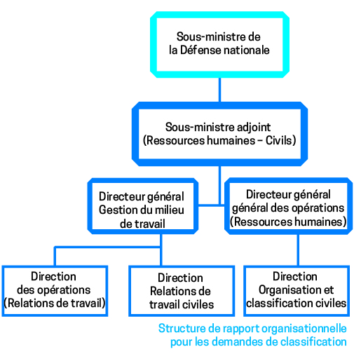 Au sein du ministère de la Défense nationale, la Direction – Organisation et classification civiles est sous-délégataire des pouvoirs de surveillance et de mise en œuvre des politiques ministériels, plans et programmes liés à la classification des postes occupés par des employés civils. Cela comprend l’administration des griefs de classification au ministère de la Défense nationale.[21]