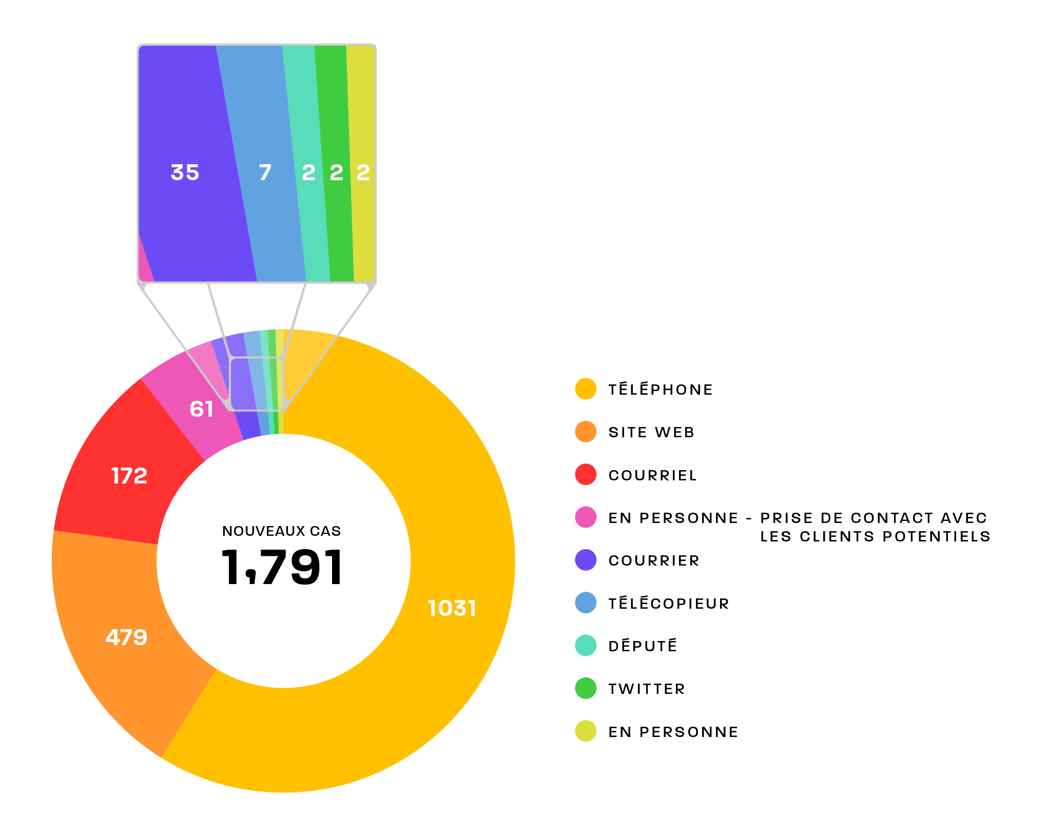 Au cours de la dernière année, les moyens les plus utilisés pour communiquer avec le Bureau de l’Ombudsman ont été le numéro de téléphone sans frais 1888-828-3626 et le site Web de l’Ombudsman (notamment le formulaire de plainte en ligne sécurisé). Les membres de la communauté de la Défense ont aussi communiqué avec le Bureau par courriel, par la poste, par télécopieur, en personne et par l’intermédiaire de leur député.