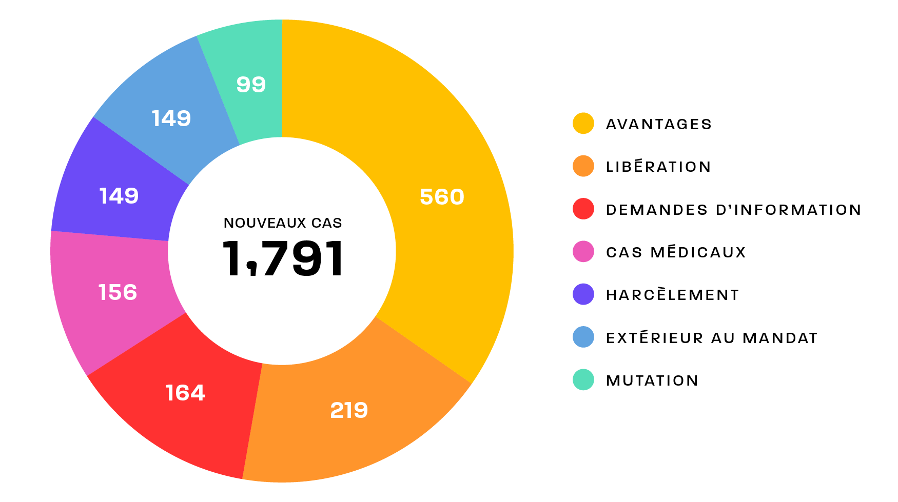 Au total, le Bureau a traité 2 244 cas et a clos 1 913 dossiers (ce qui comprend les nouveaux cas, les cas réexaminés et les cas reportés d’années précédentes).