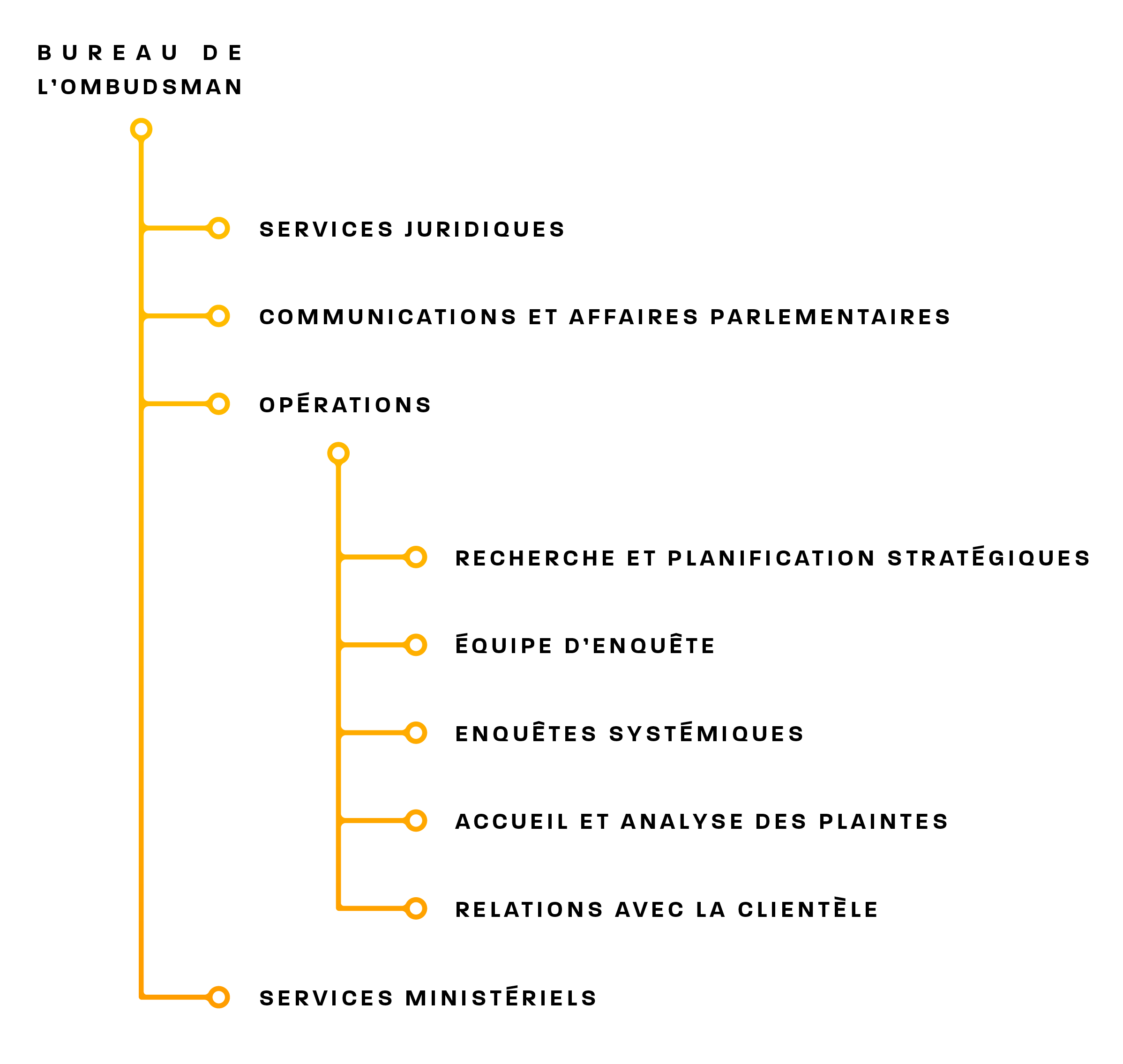 L’Ombudsman compte sur l’appui d’un Bureau composé de plus de 60 fonctionnaires fédéraux, parmi lesquels on retrouve des enquêteurs, des agents de résolution de conflits, des analystes des plaintes et d’autres employés spécialisés. Parmi les enquêteurs de l’Ombudsman, on compte des anciens policiers, des anciens membres des Forces armées canadiennes de tous les grades et de toutes les professions, et des employés provenant de l’ensemble de la fonction publique canadienne.