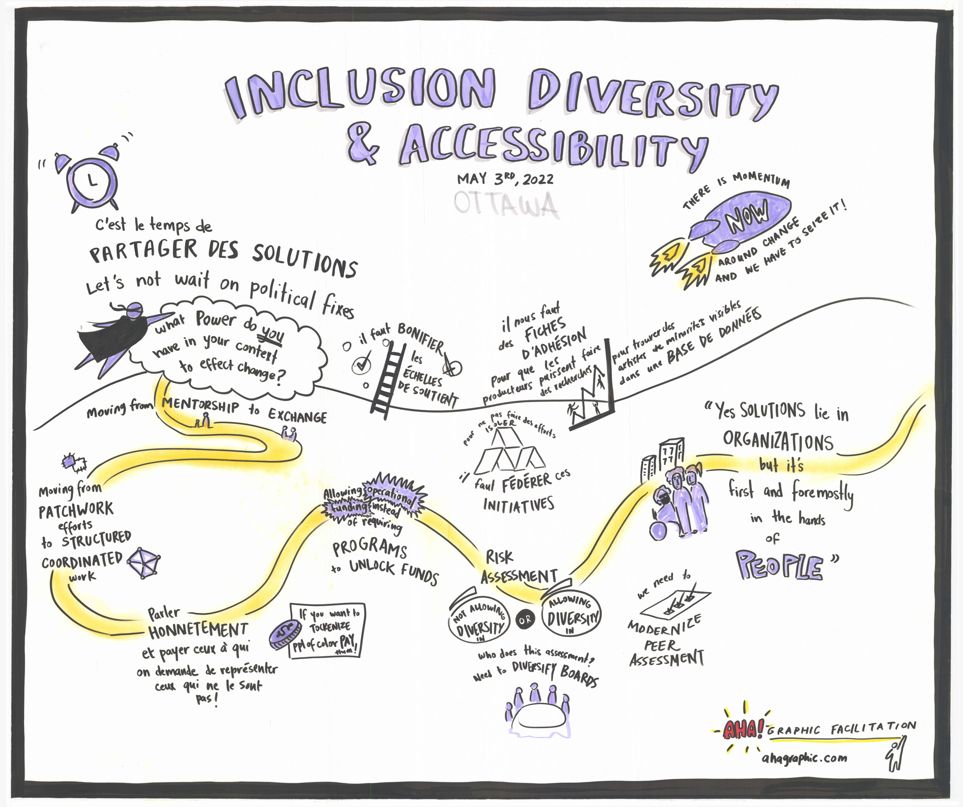 - Être le reflet du Canada d’aujourd’hui : Les participants ont indiqué qu’il faut accroître la diversité, l’inclusion et l’équité dans tous les aspects du travail. Ils veulent voir le reflet de la véritable composition du Canada dans les postes décisionnels, dans les productions artistiques et dans les publics. Ils ont plaidé en faveur de nouvelles approches inclusives à la politique culturelle.