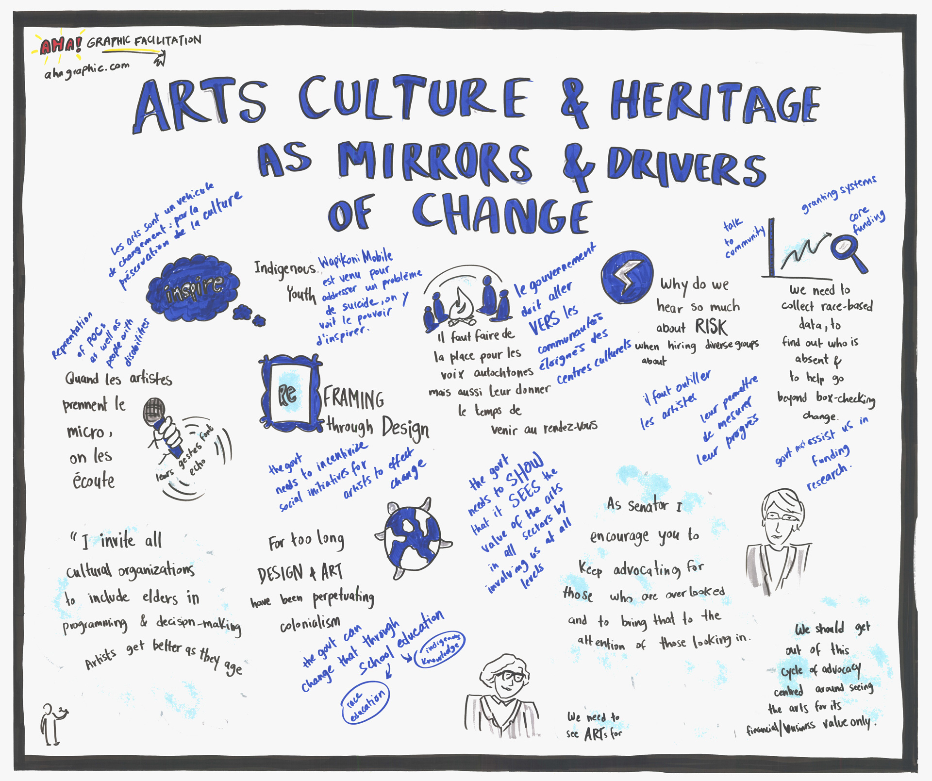 - La contribution des secteurs culturels à la réconciliation, à la lutte contre les changements climatiques et à l’édification d’une société ouverte et plus inclusive : Pour ce faire, il faut encourager la diversité à tous les niveaux de hiérarchie organisationnelle, améliorer la représentation des communautés racisées, et respecter l’autonomie des peuples et organisations autochtones à prendre leurs propres décisions. De l’avis des participants, les secteurs des arts, de la culture et du patrimoine ont aussi un rôle de leader à jouer dans la promotion d’un avenir plus vert.