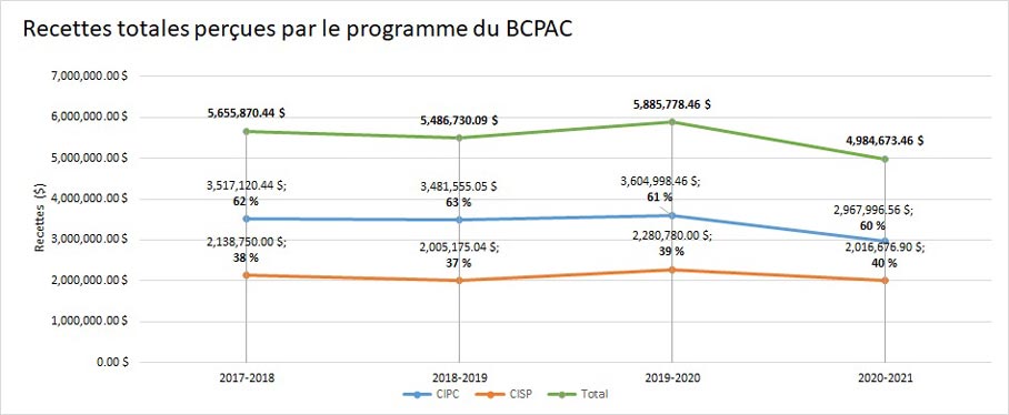 Le BCPAC a reçu plus de 2 600 demandes de certification et a délivré plus de 2 700 certificats en 2020-2021, d’une valeur projetée de 550 M$, aux sociétés de production cinématographique et magnétoscopique canadiennes et aux personnes employées dans l’industrie cinématographique et magnétoscopique au Canada. Le BCPAC est financé par les frais facturés aux demandeurs pour le traitement des demandes de crédit d’impôt. Les recettes perçues par le BCPAC sont restées relativement stables, avec une réduction notable en 2020-2021, que l’on suppose être le résultat des restrictions imposées aux productions audiovisuelles au Canada en raison de la pandémie de COVID-19.