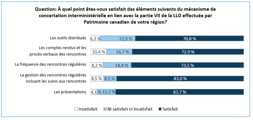 83 % des répondants au sondage (coordonnateurs 41 en région) étaient d’accord pour dire que le comité a sensibilisé les gestionnaires fédéraux au sujet des responsabilités découlant de l’article 41 de la LLO.