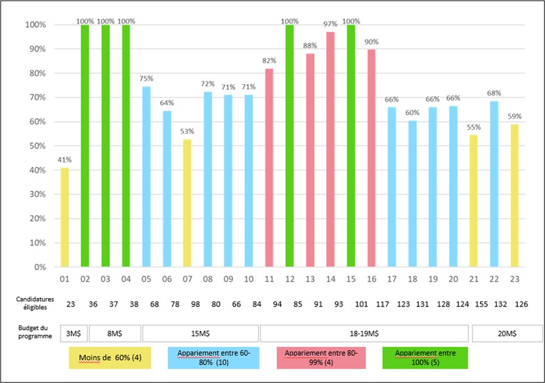 | Candidatures éligibles | Budget du programme (en millions de dollars) | Ratio d’appariement (en pourcentage) | |