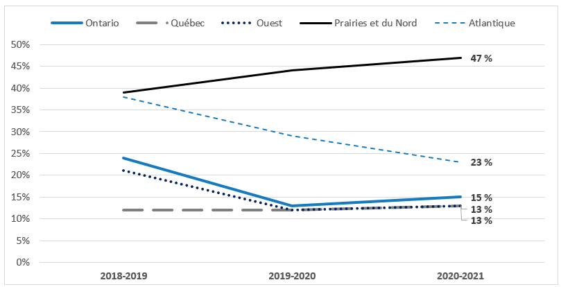 La modification la plus importante apportée à l’efficience du programme au cours de la période d’évaluation a été l’introduction du processus « Voie-1 ». En offrant un processus d’évaluation rapide pour les demandes moins coûteuses au Canada en fête, le processus a permis au programme d’accélérer les décisions de financement et de réduire les coûts opérationnels dans toutes les régions au cours des 3 dernières années de la période d’évaluation. L’évaluation a révélé que les normes de service ont été respectées par le PCC la plupart du temps, et qu’il n’y a pas d’inquiétude majeure quant à l’efficience du programme.