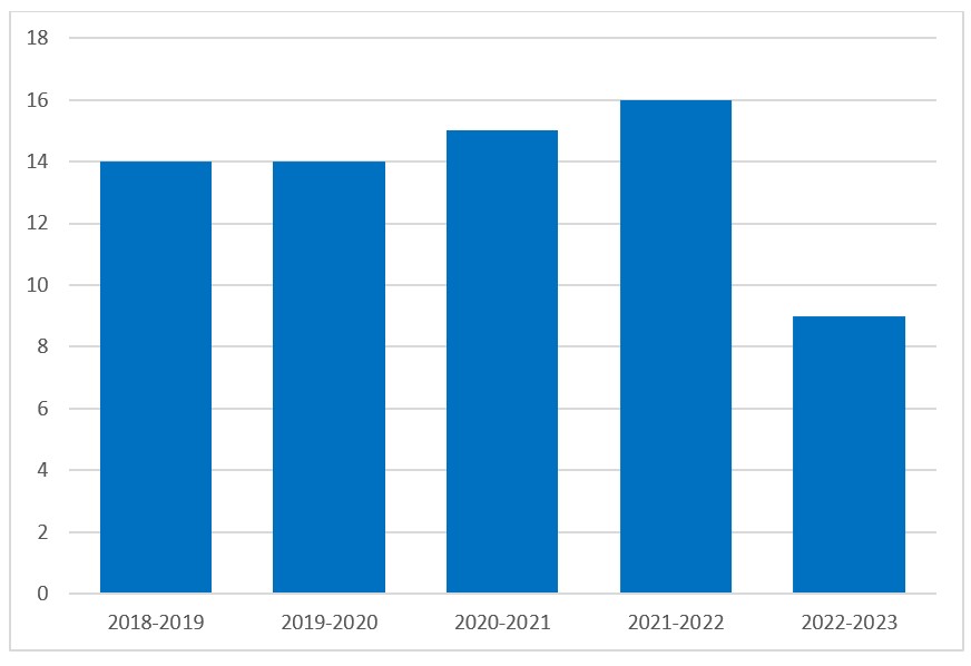 Entre le 1er avril 2022 et le 31 mars 2023, 9 demandes d'information officielles ont été présentées en vertu de la Loi. Il s’agit de 7 demandes reçues de moins par rapport à la période précédente et le plus bas nombre de demandes reçues au cours des 5 derniers exercices, comme illustré par le diagramme 1.