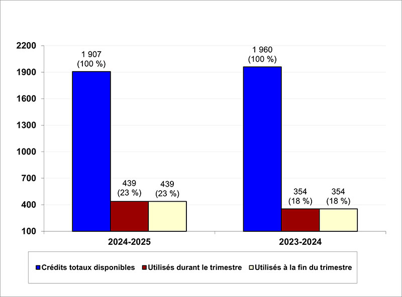 | Autorisations | Crédits totaux disponibles pour l'exercice se terminant le 31 mars 2025Note de bas de page 1 | Crédits utilisés pour le trimestre terminé le 30 juin 2024 | Cumul des crédits utilisés à la fin du trimestre 2024-2025 | Crédits totaux disponibles pour l'exercice se terminant le 31 mars 2024Note de bas de page 1 | Crédits utilisés pour le trimestre terminé le 30 juin 2023 | Cumul des crédits utilisés à la fin du trimestre 2023-2024 |