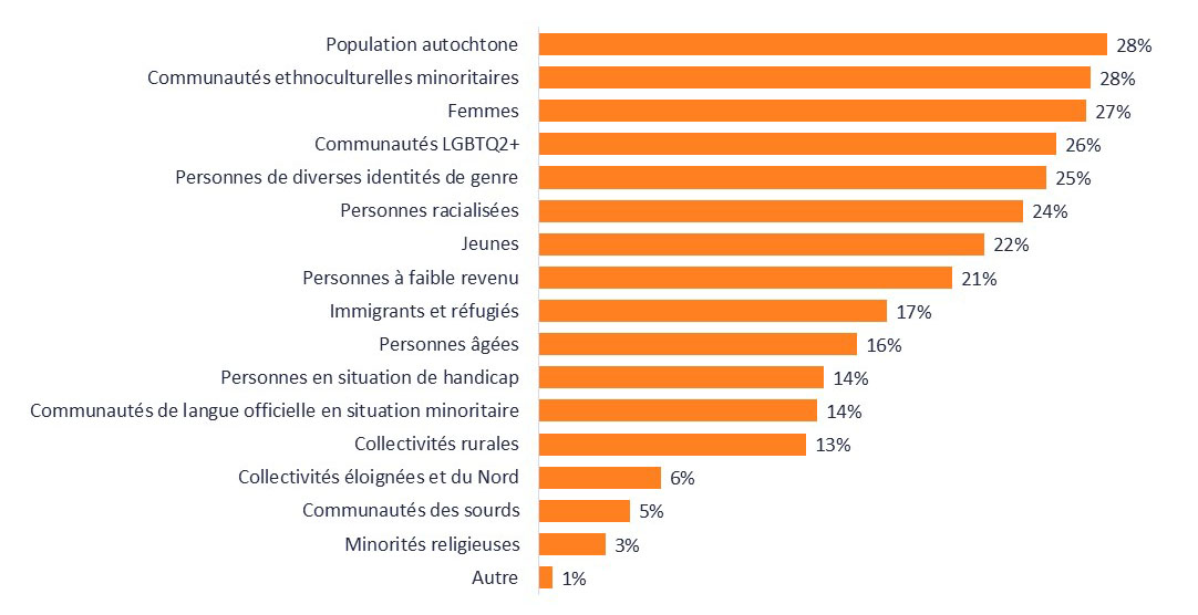 - Communautés ethnoculturelles minoritaires – Communautés ayant un sentiment partagé d'appartenance à un groupe fondé sur des caractéristiques communes telles que la langue, l'origine géographique, la nationalité, les traditions culturelles, l'ascendance et l'histoire des migrations, entre autres.