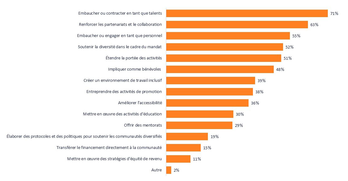 Les fonds qui ont eu un impact sur les communautés dignes d'équité ont principalement servi à embaucher ou à contracter des membres de ces communautés, soit comme talents (71 %), soit comme personnel (55 %), ainsi qu'à renforcer les partenariats et la collaboration (63 %).