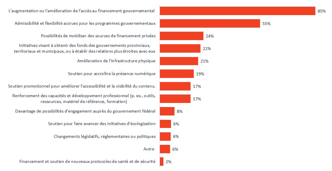 Les répondants ont le plus souvent cité le besoin d'un financement plus important (74 %) et d'une meilleure admissibilité (51 %) aux programmes gouvernementaux. Vient ensuite les possibilités de mobiliser des sources de financement privées (24 %).