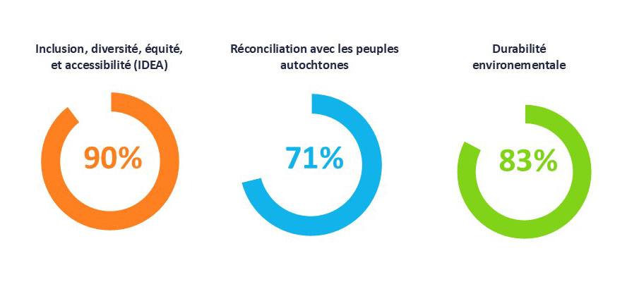 Les répondants mettent en place des stratégies pour soutenir l’inclusion, la diversité, l’équité, et l’accessibilité (IDEA), la réconciliation avec les peuples autochtones, et la durabilité environnementale