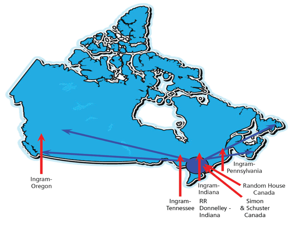 Une carte du Canada représentant la chaîne d'approvisionnement du livre en Amérique du Nord. Les flèches rouges montrent quatre routes d'approvisionnement non centralisées des États-Unis vers le Canada qui appartiennent à la société Ingram. Les flèches bleues montrent les routes d'approvisionnement Canada-Canada qui proviennent d'une source dans le centre du Canada, par exemple: