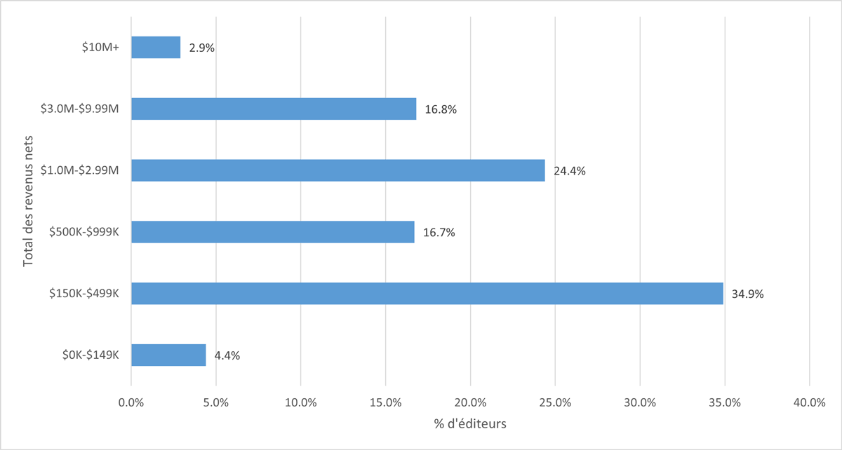 Un profil de l’industrieNote de bas de page 2 publié en 2018 a relevé 245 éditeurs canadiens en langue anglaise exerçant des activités au Canada et qui avaient des retombées économiques de près de 500 millions de dollars. Quelque 78 % représentaient de petites entreprises privées de dix employés ou moins, et la plupart enregistraient un chiffre d’affaires annuel de moins d’un million de dollars.