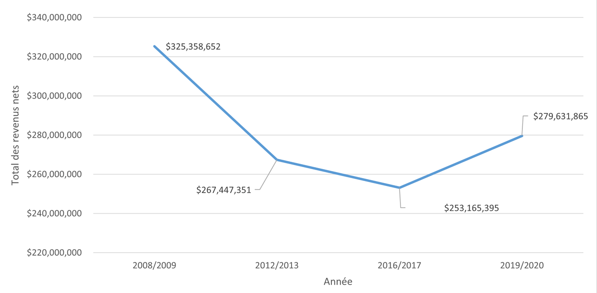 - Figure 3 : Revenu net total déclaré par les bénéficiaires du FLC de langue anglaise — 2008-2009, 2012-2013, 2016-2017 et 2019-2020