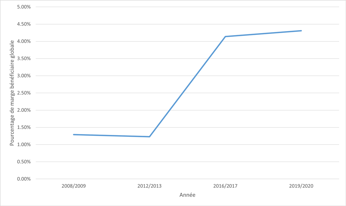 - Figure 4 : Pourcentage de marge bénéficiaire globale déclaré par les bénéficiaires du FLC de langue anglaise — 2008-2009, 2012-2013, 2016-2017 et 2019-2020