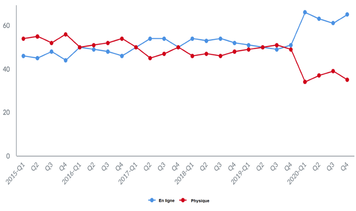 - Figure 7 : Proportion d’acheteurs déclarant avoir acheté des livres en ligne plutôt qu’en personne — 2015-2020