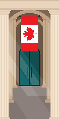 (La feuille d’érable pointe vers l’extérieur du bâtiment)