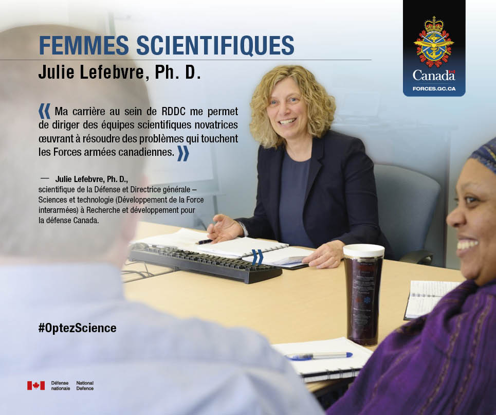 Un série des infographies a été mise au point pour mettre en lumière les femmes en science qui font partie de l’équipe de Recherche et développement pour la défense Canada (RDDC). Cette série souligne les femmes canadiennes en science de défense.