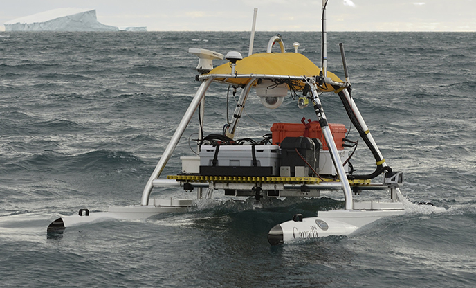 Un véhicule de surface sans pilote effectue des essais à Gascoyne Inlet, près du détroit de Barrows, sur l’île de Devon (Nunavut). Ce type de véhicules autonomes sans pilote est utilisé pour améliorer la connaissance de la situation en mer et pour surveiller l’évolution des menaces et des événements.