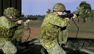 Deux soldats s’exercent au tir pendant une mission simulée à l’aide du simulateur de tir aux armes légères de RDDC. Ce type d’entraînement permet aux soldats de mieux se préparer à la réalité du champ de bataille.