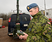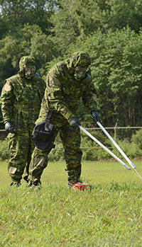 Des employés de RDDC font une démonstration de détection de sources radiologiques et de réduction des risques dans le cadre d’une formation avancée en intervention pour les urgences radiologiques qu’ils donnent aux membres des FAC.