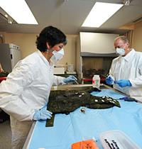 Des scientifiques effectuent l’analyse postincident d’équipements de protection personnelle de retour d’Afghanistan.