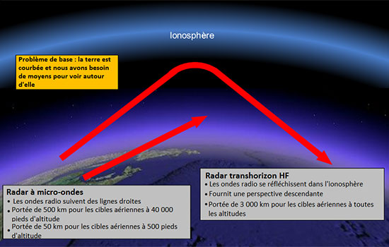Les systèmes de radars transhorizon (RTH) ont pour but de détecter les cibles se trouvant hors du champ de vision et au delà de la ligne d’horizon, à la différence des radars traditionnels, qui sont limités à la détection des objets se trouvant davantage dans l’axe de visibilité directe. Le rebond des ondes radar sur la haute atmosphère permet aux RTH de détecter des cibles sur une distance beaucoup plus grande.