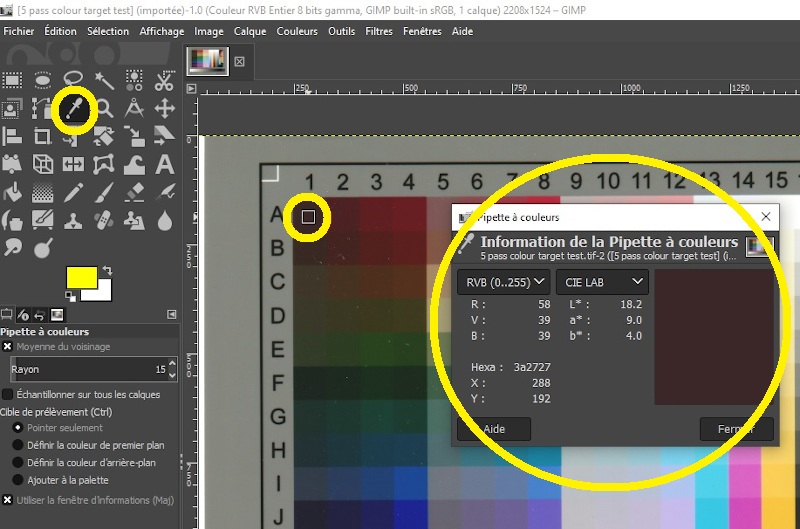 - Cliquer sur la couleur à échantillonner. Les résultats s’affichent dans la fenêtre « Pipette à couleurs », à droite.