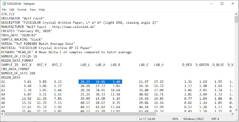 Figure 39. Consultation du fichier de données IT8 (en anglais seulement). VueScan a utilisé ce fichier pour créer le profil. Il a été copié du DVD livré avec les cartes d’étalonnage IT8. Les valeurs de l’échantillon de couleur A1 sont en surbrillance. Ce sont les valeurs avec lesquelles il faut comparer les valeurs échantillonnées.