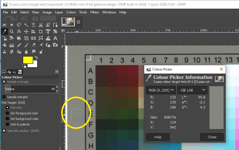 Figure 42. Échantillonnage d’une région en gris neutre d’une carte d’échantillonnage numérisée. La même démarche sert à détecter les variations de couleur et d’éclairement. À noter le rayon étendu de l’échantillon : 40 pixels.