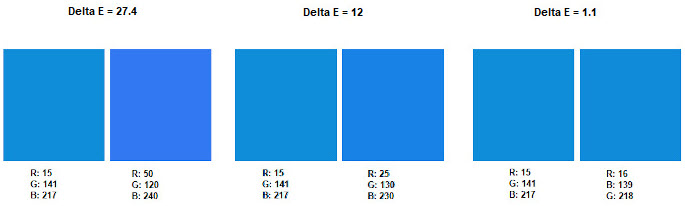 On peut calculer la distance colorimétrique entre des espaces chromatiques différents, car ce site peut aussi convertir les valeurs de couleur entre deux espaces. Aussi, si l’on intervertit l’ordre des échantillons, les résultats obtenus sont souvent identiques, mais pas toujours. Pour calculer une distance colorimétrique sur plusieurs décimales, nous recommandons de recharger la page Web après avoir fait un premier calcul, d’inverser les échantillons, puis de calculer la moyenne des deux résultats obtenus.