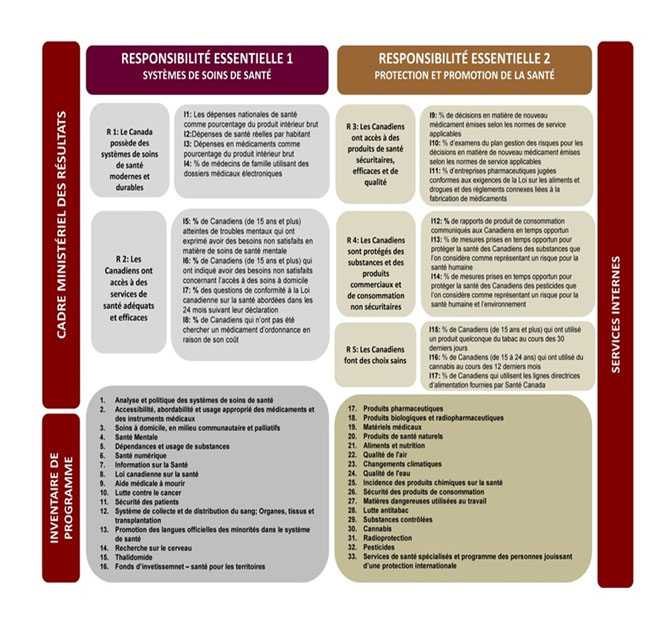 Le Cadre de résultats ministériels (CRM) décrit deux responsabilités essentielles pour le Ministère : les systèmes de soins de santé et la protection et promotion de la santé. Ce cadre d'établissement de rapports fournit la structure des activités planifiées, qui sont organisées en fonction de ces responsabilités essentielles et des résultats correspondants (résumés à la page 54).