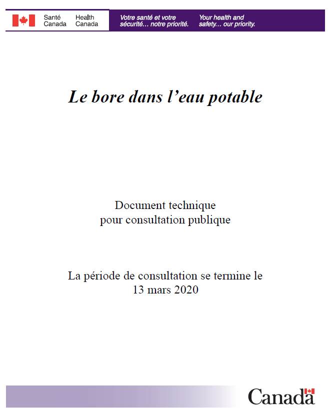 Le présent document technique décrit l’évaluation de l’information disponible sur le bore dans le but de mettre à jour la ou les valeurs de recommandations actuelles pour la présence du bore dans l’eau potable. La présente consultation vise à solliciter des commentaires sur la valeur de la recommandation proposée, la démarche suivie pour l’élaborer et les coûts possibles de sa mise en œuvre.