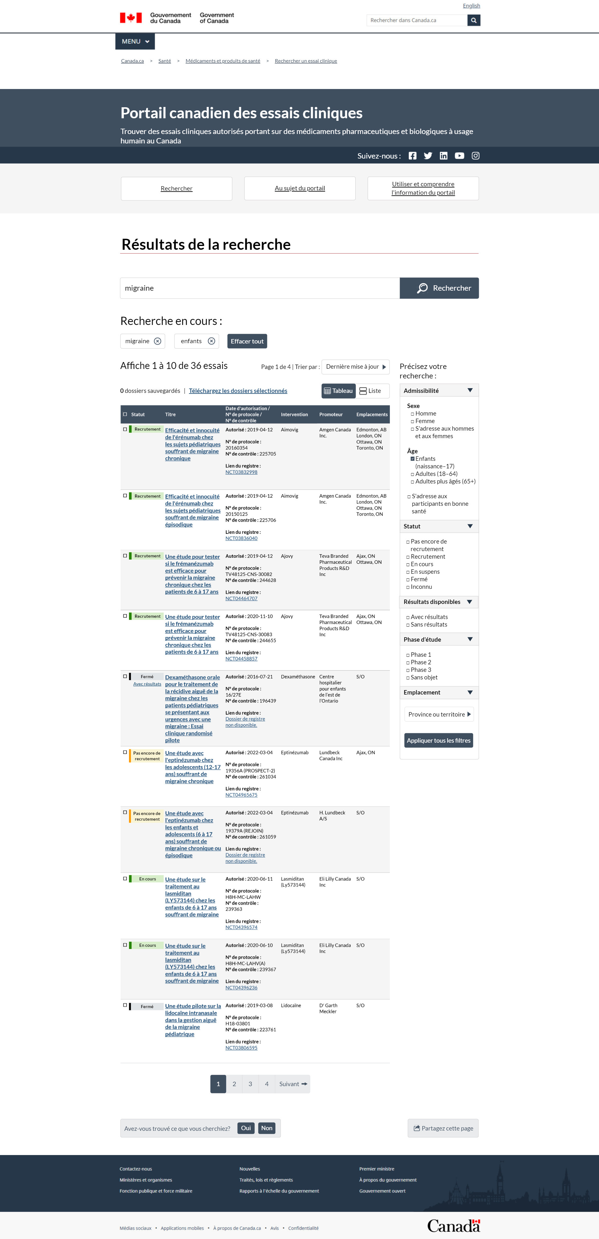 Sous l'en-tête se trouve le titre de cette page, Résultats de la recherche. Le champ de recherche suit le titre de la page. Il comporte un bouton de recherche à droite, où vous pouvez entrer les termes de recherche. La zone de saisie contient le mot « migraine », qui aurait été saisi à la page de recherche des essais cliniques. Sous le champ de recherche, on voit le titre Recherche en cours. Sous ce titre apparaissent 2 zones de saisie, l'une avec le terme migraine et l'autre avec le mot enfants. Vous pouvez affiner votre recherche en excluant l'un ou l'autre des termes et en cliquant sur le X dans la zone de saisie. À droite des termes de recherche en cours se trouve le bouton Effacer tout, si vous devez réinitialiser la recherche. Les résultats se trouvent sous les termes de recherche. Le nombre total de résultats apparaît en premier. Dans le présent exemple, les résultats de la recherche indiquent 1 à 10 études sur 36. Ces résultats sont présentés sur 4 pages et vous êtes actuellement à la page 1. À droite du total des résultats, on trouve un menu déroulant. Vous pouvez utiliser le menu déroulant pour classer vos résultats selon l'une des 5 façons suivantes :