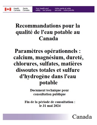 Le présent document technique évalue les renseignements disponibles sur le calcium, le magnésium, la dureté, les chlorures, les sulfates, les matières dissoutes totales (MDT) et le sulfure (sous forme de sulfure d'hydrogène) afin de mettre à jour les valeurs recommandées pour ces paramètres opérationnels dans l'eau potable. La présente consultation vise à recueillir des commentaires sur les recommandations proposées pour ces paramètres opérationnels, sur la démarche suivie pour leur élaboration et sur les répercussions possibles de leur mise en œuvre.