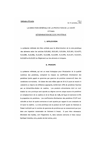 La méthode décrite ci-dessus, comportant six pages, l'Appendice A comportant deux pages, A-l - A-2 inclus, l'Appendice B comportant trois pages, B-l - B-3 inclus, et identifiée comme FO-1, Détermination de cote protéique, en date du 15 octobre 1981, est désignée, par la présente, la "Méthode officielle" aux fins des articles B.01.062, B.01.063, B.01.064, B.01.065, B.14.073, B.14.085, B.14.086, B.14.087, B.14.088, B.14.089, B.14.090, B.21.027, B.22.027, B.22.029 et B.22.032 du Règlement sur les aliments et drogues.