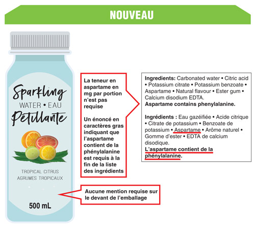 Tous les édulcorants contenus dans les aliments continueront de figurer dans la liste des ingrédients présentée sur l'étiquette du produit. De plus, les aliments édulcorés avec de l'aspartame doivent toujours inclure une déclaration avertissant les personnes atteintes de phénylcétonurie que l'aliment contient de la phénylalanine. Cette déclaration doit maintenant figurer en caractères gras à la suite de la liste des ingrédients.