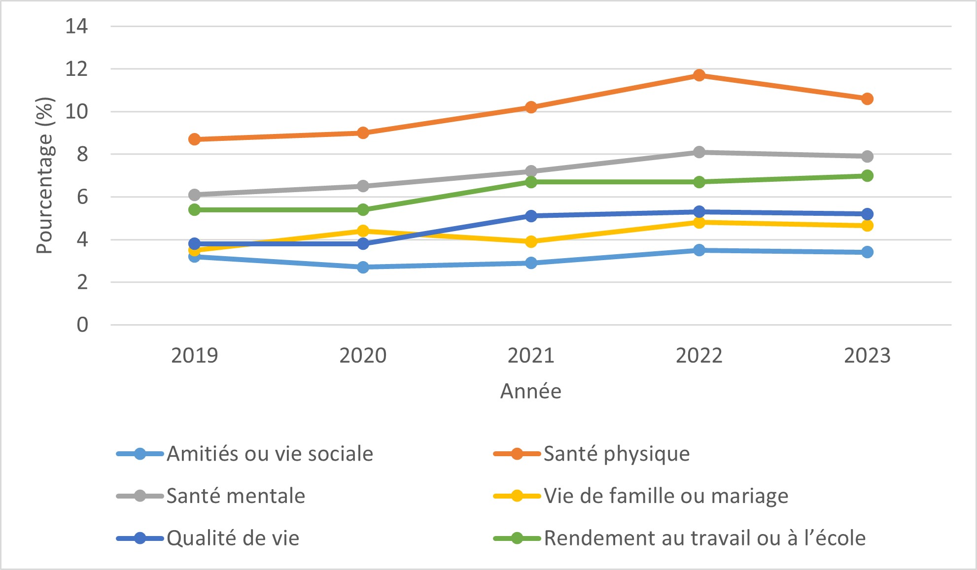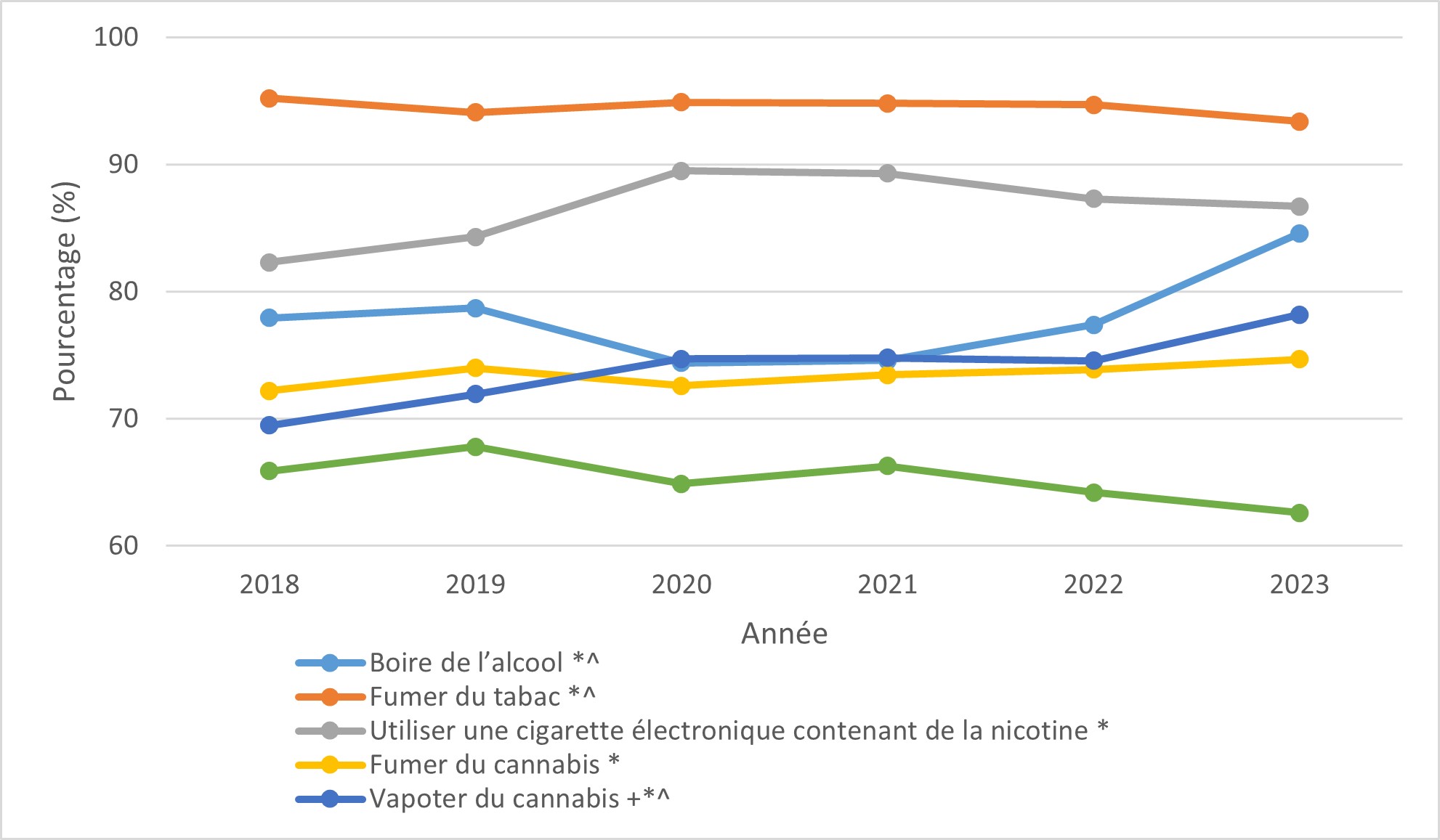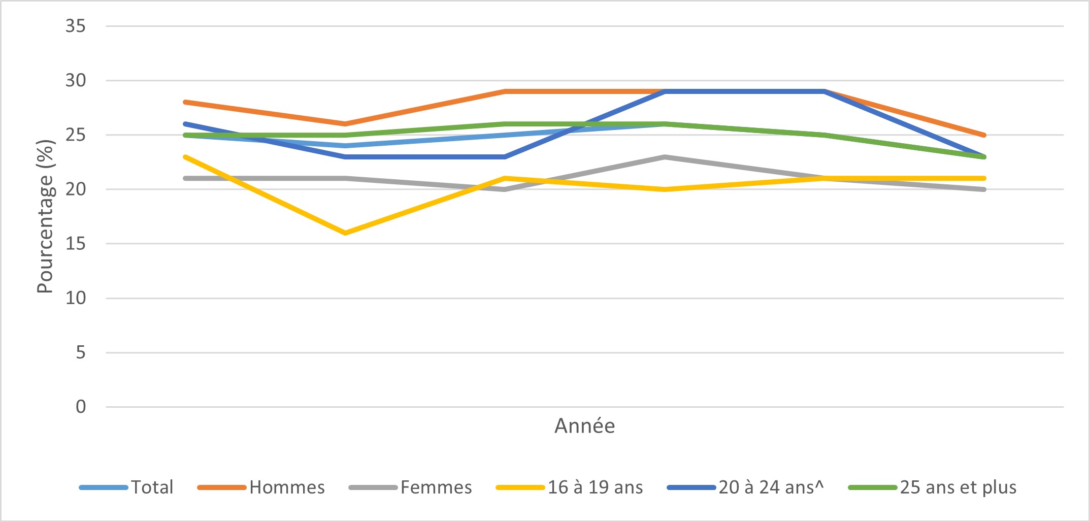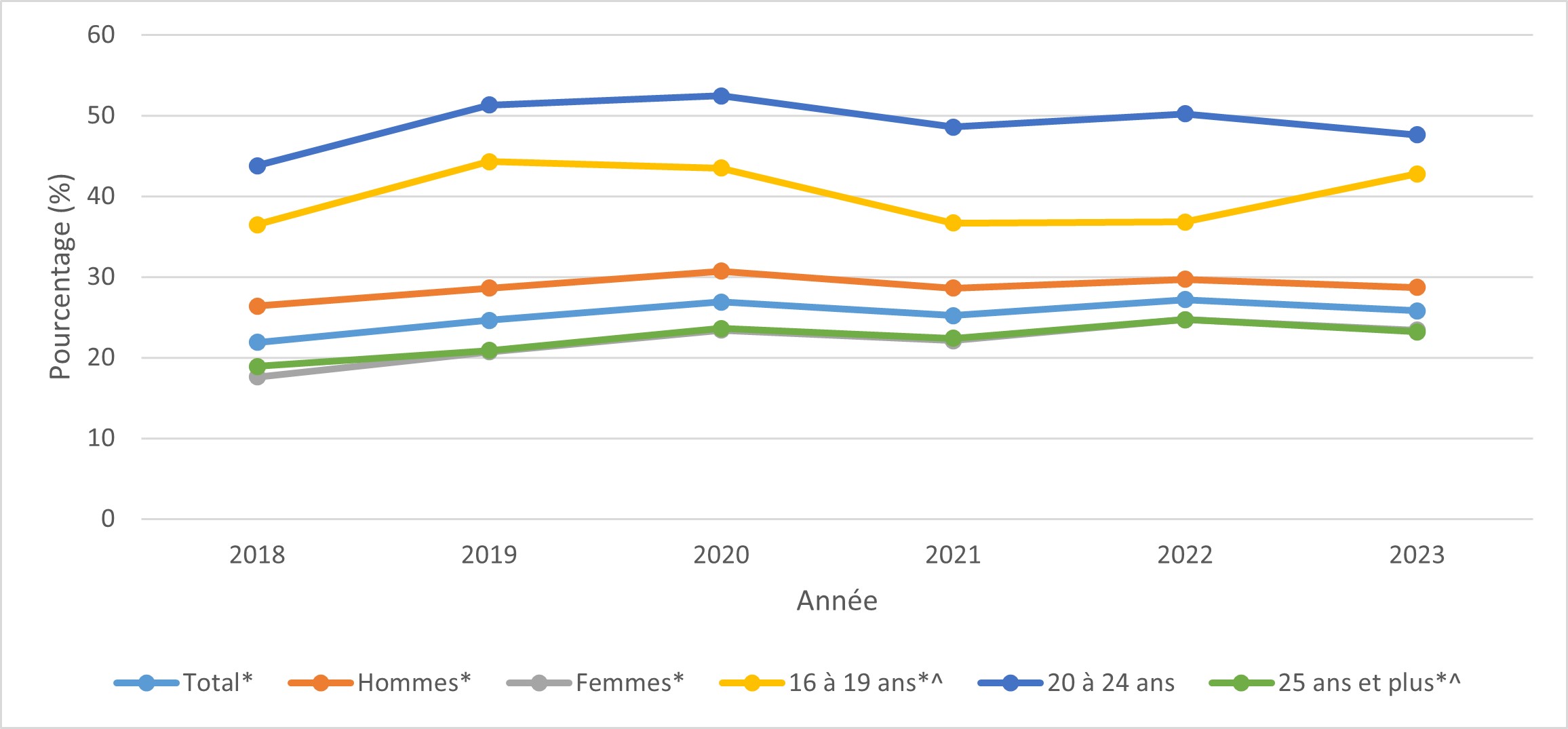 Toutes les augmentations et diminutions signalées dans le texte ci-dessous sont des changements statistiquement significatifs (ce qui signifie qu'ils ne sont pas susceptibles d'être le fruit du hasard seulement). Pour améliorer la lisibilité, l'expression « statistiquement significatif » ne sera pas répétée. De même, le texte indique parfois que la proportion est « inchangée » ou n'est pas différente entre deux groupes, même si les chiffres ne sont pas identiques. Cela se produit lorsque la différence entre les chiffres n'est pas statistiquement significative.