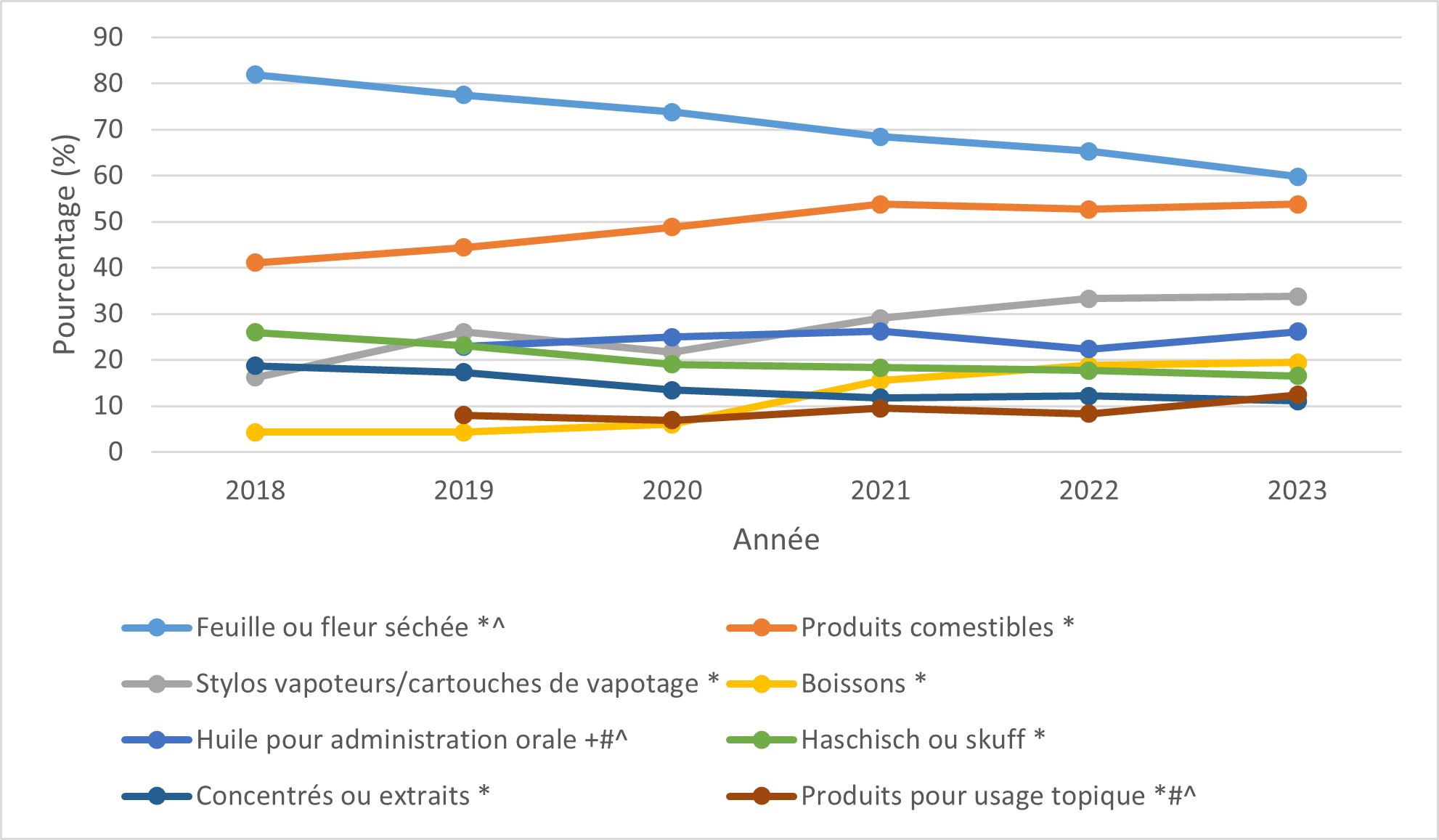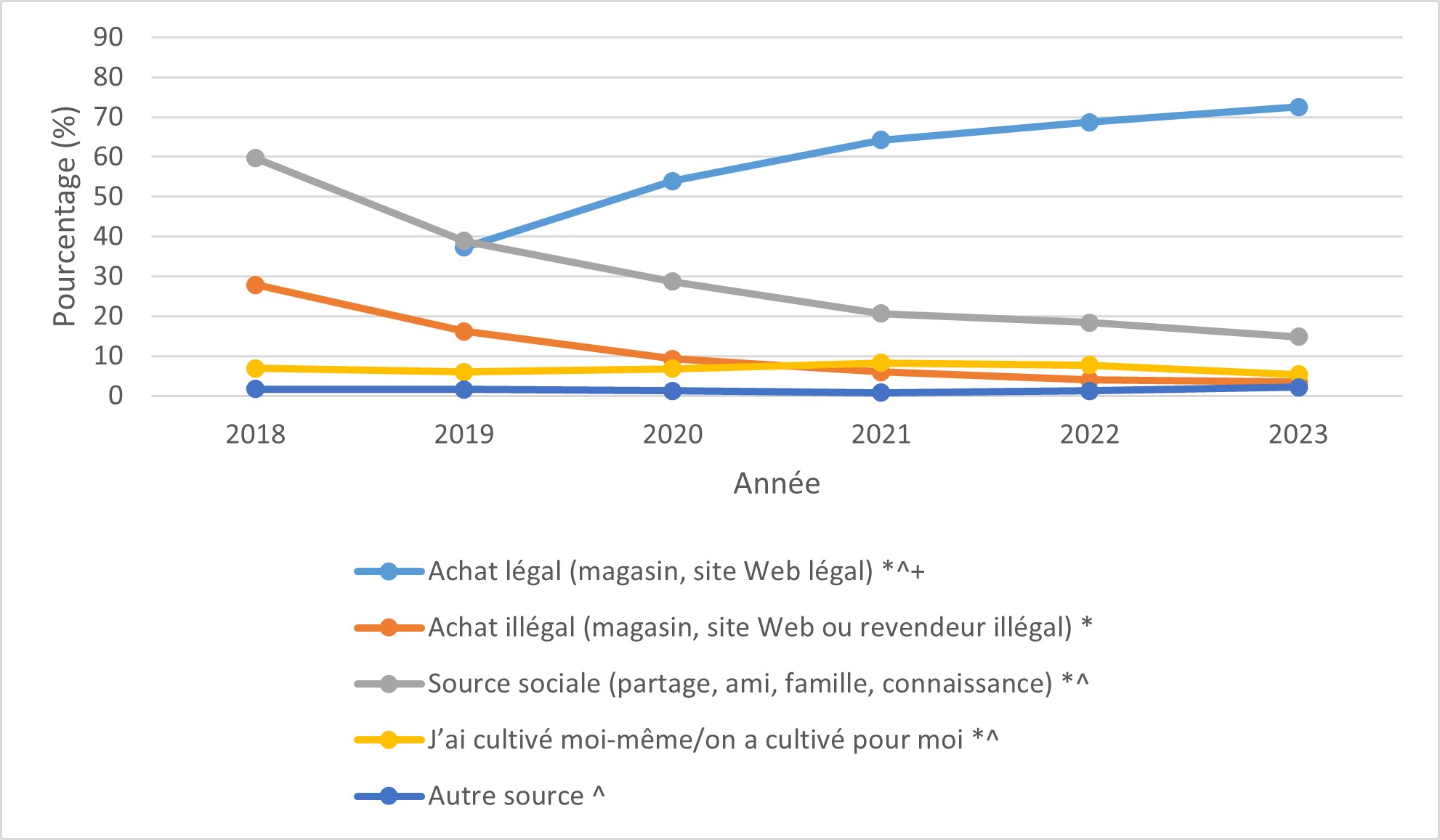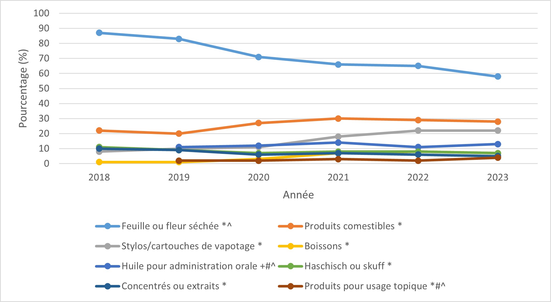 Les résultats de l'enquête 2023 sont présentés par thème. L'ECC est menée depuis 5 ans, depuis que la consommation du cannabis à des fins non médicales a été légalisée au Canada en octobre 2018. Afin de documenter les changements survenus au fil du temps, des comparaisons avec l'année 2018 sont présentées. Il convient de noter que pour les questions ajoutées à l'enquête au cours des cycles ultérieurs, les résultats de 2023 sont comparés à ceux de la première année au cours de laquelle la question a été posée. Les résultats sont également comparés au cycle d'enquête précédent (2022). Sauf indication contraire, les résultats sont inchangés par rapport à 2022.
