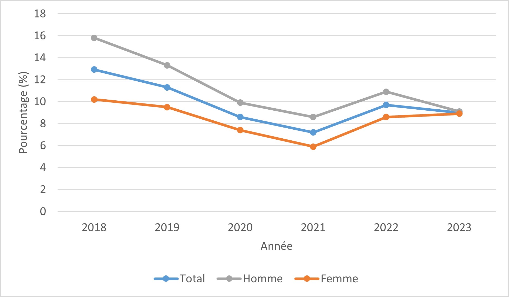 | Homme (%) | 16 | 13 | 10 | 9 | 11 | 9 |